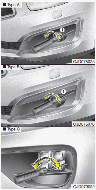 Передняя противотуманная фара может быть направлена как такой же способ наведения фар. С передними противотуманными фарами и аккумулятором в норме состояние, направьте передние противотуманные фары. К направьте переднюю противотуманную фару вверх или вниз, поверните привод (1) по часовой стрелке или против часовой стрелки.