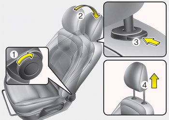 3. Нажмите кнопку фиксатора подголовника (3). потянув подголовник вверх (4).