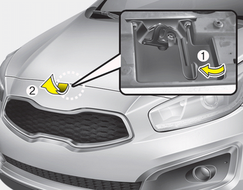 2. Подойдите к передней части автомобиля, поднимите слегка приоткройте капот, нажмите предохранительный рычаг внутрь в центре капота и поднимите капот.