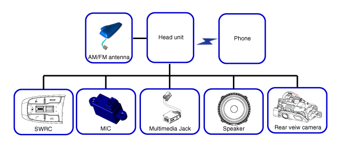 Система в основном состоит из клавиатуры для работы системы AVN, ЖК-монитор, головное устройство с громкой связью Bluetooth, распознавание голоса и навигация, музыкальный усилитель и мультимедийный разъем, который подключается к другим внешним устройства.