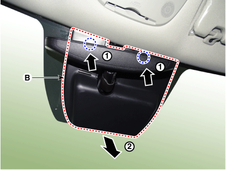 Снимите кожух внутреннего зеркала заднего вида (А), (В).