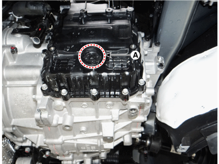 Поднимите автомобиль и снимите пробку уровня ATF (A) с корпуса клапана. крышка.