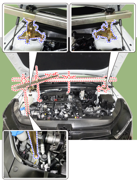 Соберите опору двигателя в машинном отделении. (См. Специальные сервисные инструменты — «Сборочный чертеж крепления опоры двигателя»)