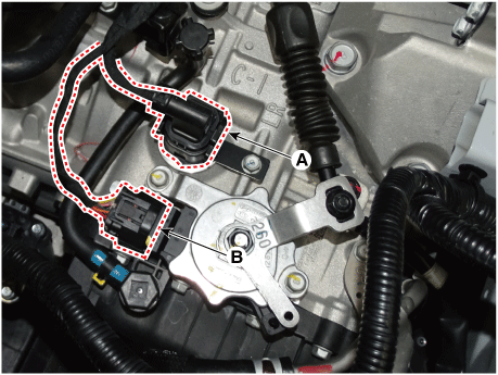 Ослабьте болт крепления стартера (А) и болты крепления коробки передач (В).