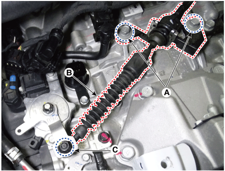 Снимите трос переключения передач (В), предварительно ослабив гайку (С) и болты (А).