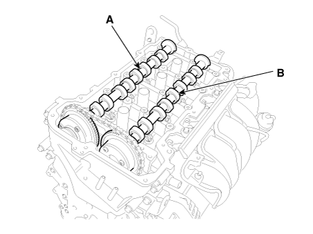Сначала снимите выпускной распределительный вал (А), затем впускной распределительный вал (В).