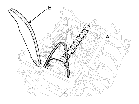 Поместите впускной распределительный вал (А) и затем вставьте рычаг натяжителя (В) вдоль цепь ГРМ.