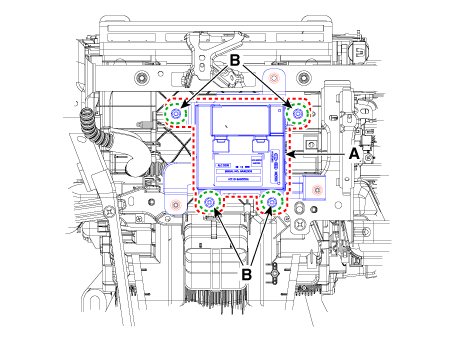 Снимите блок экстренного вызова (A) после ослабления крепежных гаек (B).