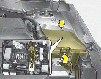 2. Снимите крышку панели предохранителей, нажав на выступ и потянув крышку вверх.