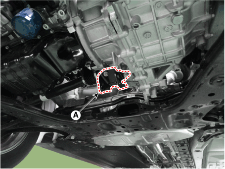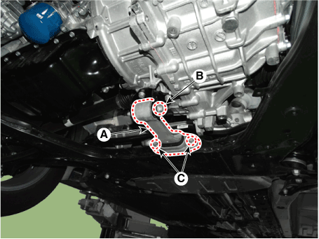 Снимите болт крепления опорного кронштейна коробки передач (А).