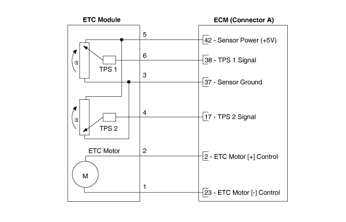 ECM использует сигнал APS для расчета целевого угла дроссельной заслонки; в затем положение дроссельной заслонки регулируется с помощью управления ECM двигателя ETC. |