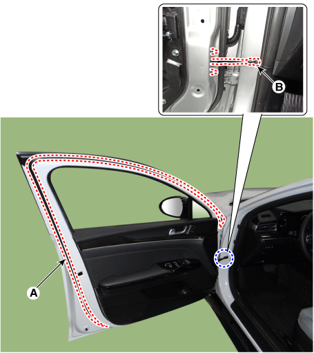 Отсоедините зажимы, затем снимите боковой уплотнитель передней двери (A).