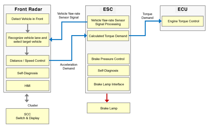 Интеллектуальный круиз-контроль (SCC): интеллектуальная система круиз-контроля позволяет водитель, чтобы запрограммировать транспортное средство для управления скоростью и расстоянием следования. Система SCC обнаруживает впереди идущее транспортное средство, не нажимая педаль тормоза или педаль газа.