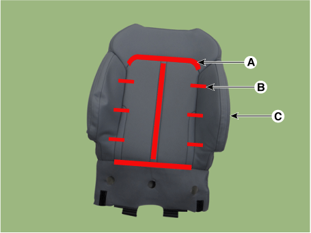 Удалив застежку-липучку (A) и зажимы-кольца (B) внутри обивку спинки переднего сиденья, снимите обивку спинки сиденья (С).