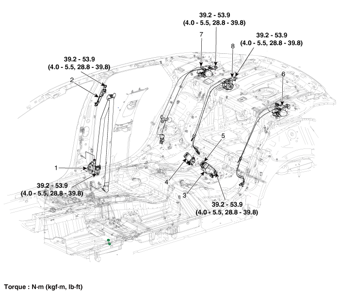6. Катушка заднего ремня безопасности [LH] 7. Катушка заднего ремня безопасности [RH] 8. Пряжка заднего центрального ремня безопасности. |