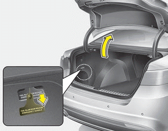 Если крышка топливного бака не открывается с помощью кнопки открывания крышки топливного бака, вы можете открыть его вручную. Откройте багажник и слегка потяните аварийную разблокировку ручка с левой стороны.