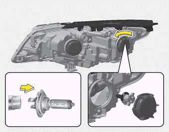 Kia Optima: Замена ламп накаливания/фары ближнего света