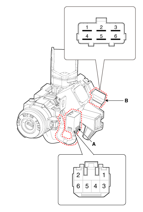 Отсоедините разъем выключателя зажигания (В) и разъем выключателя предупреждения о ключе. (А) из-под рулевой колонки.