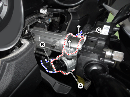Снимите узел выключателя замка зажигания (А), ослабив болты после отсоедините разъемы (B, C).