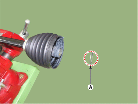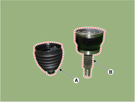 Снимите пыльник шарнира (А) и узел шарнира (В).