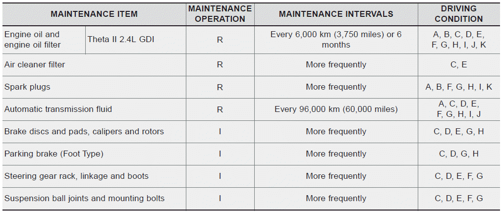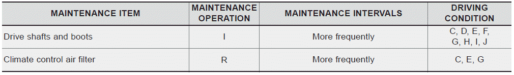 Следующие пункты должны обслуживаться чаще на автомобилях, обычно эксплуатируемых под тяжелые условия вождения. См. таблицу ниже для соответствующего технического обслуживания. интервалы.