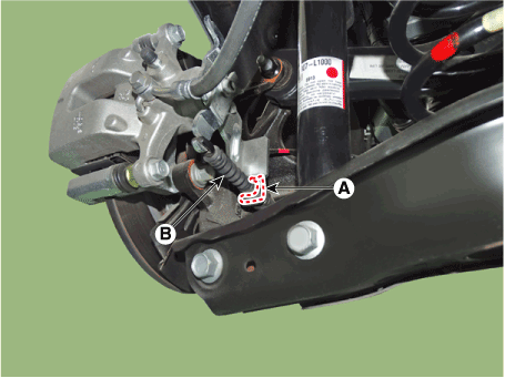 Отсоедините трос стояночного тормоза (B) после снятия троса стояночного тормоза. фиксирующий зажим (А).