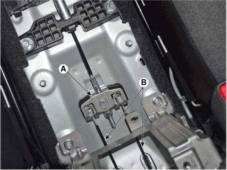 Ослабьте крепежный болт (А) и гайки (В) кронштейна троса стояночного тормоза.
