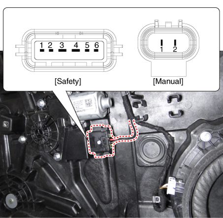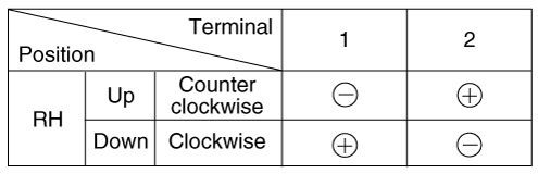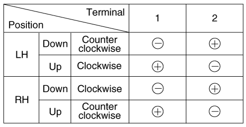 Подключите клеммы двигателя напрямую к напряжению аккумулятора (12 В) и проверьте что мотор работает ровно. Затем поменяйте полярность и убедитесь, что двигатель плавно работает в обратном направлении. Если операция неисправность, замените двигатель. [Окно безопасности двигатель]