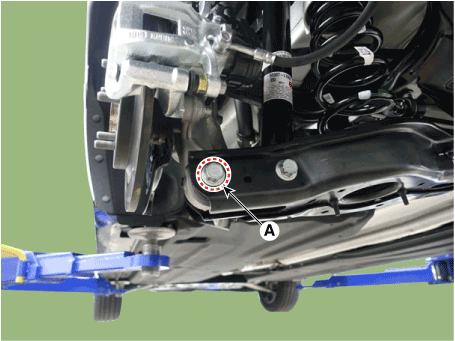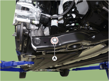 Ослабьте болт и гайку (А), затем снимите задний нижний рычаг с задний мост.