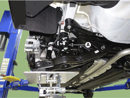 Ослабьте болт и гайку (А), а затем отсоедините заднюю стойку стабилизатора. от заднего нижнего рычага.
