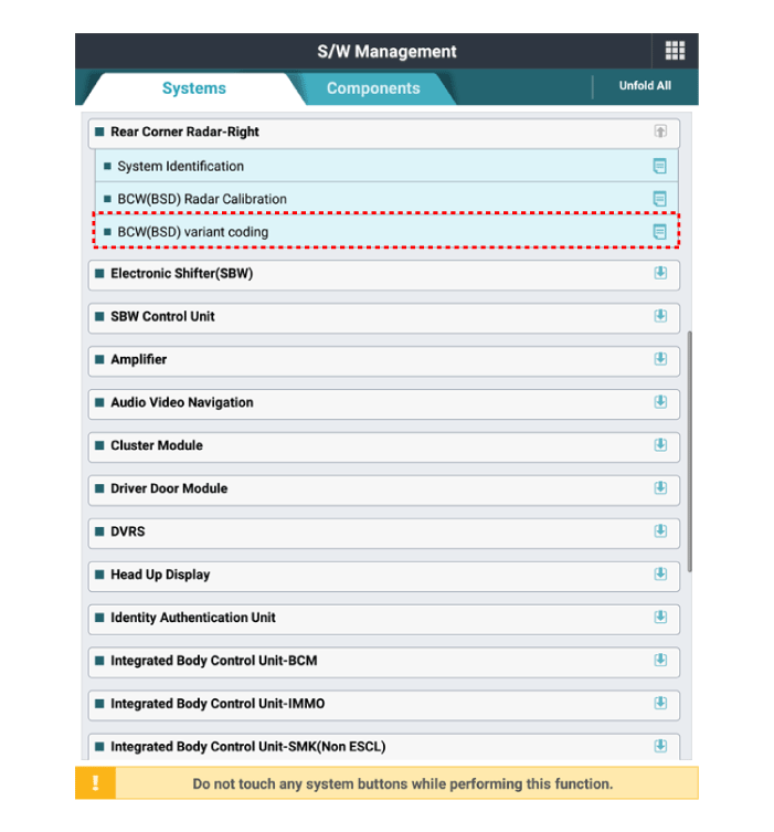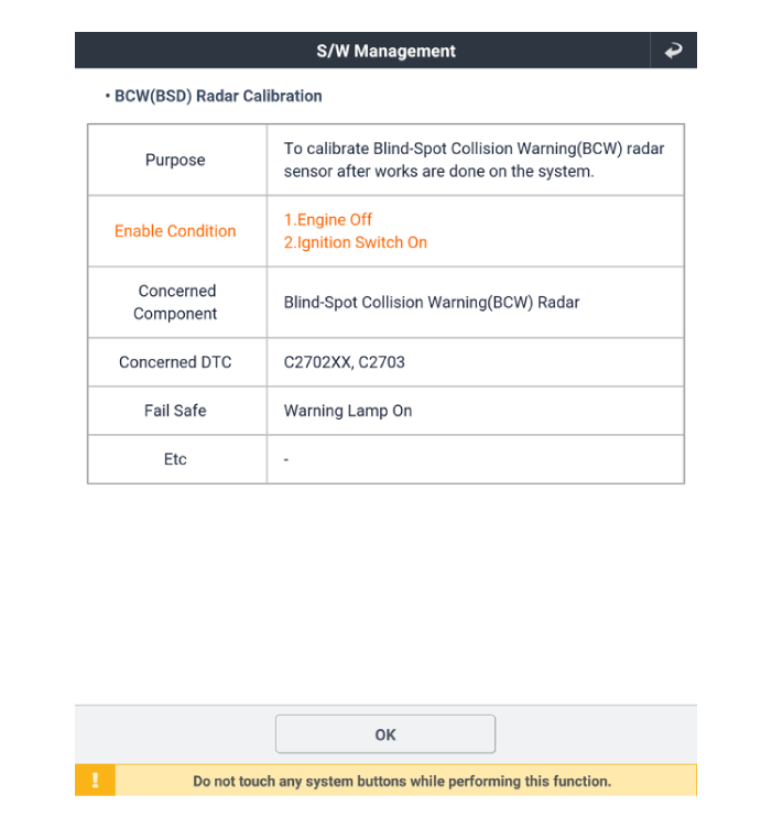 Выберите процедуру «BCW(BSD) Radar Calibration» в «Rear Corner Radar».