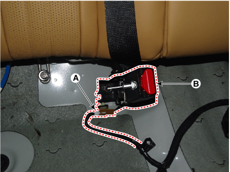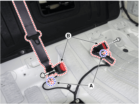 Ослабьте болты крепления и снимите замок заднего ремня безопасности (В).