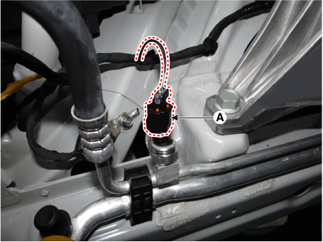 Нажмите на стопорный штифт и отсоедините разъем датчика давления кондиционера. (А).