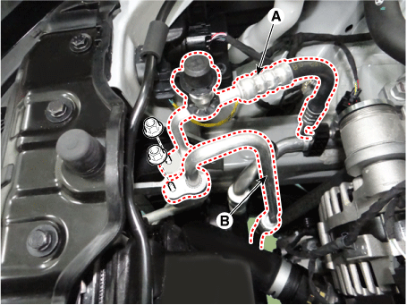 Снимите крышку машинного отделения. G 2.0 NU MPI (см. Механическая система двигателя — «Крышка двигателя») G 2.5 GDI THETA II (см. Механическая система двигателя — «Крышка двигателя») |