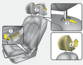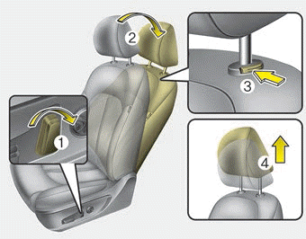 3. Нажмите кнопку фиксатора подголовника (3), потянув подголовник вверх (4).