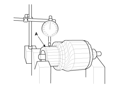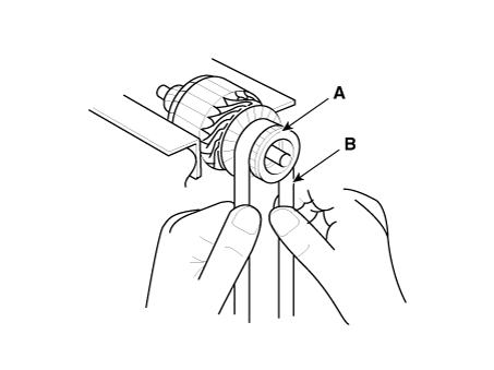 Проверьте поверхность коллектора (А). Если поверхность загрязнена или обожжена, наждачной бумагой или на токарном станке в соответствии со следующими спецификациями, или восстановить наждачной бумагой #500 или #600 (B).