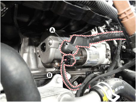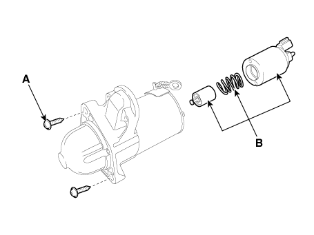 Отсоедините кабель стартера (А) от клеммы В соленоида, затем отсоедините разъем (B) от клеммы S.