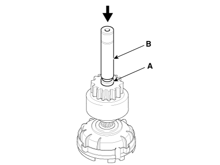 Отсоедините стопор (А), обгонную муфту (В) и внутреннюю шестерню. (С).