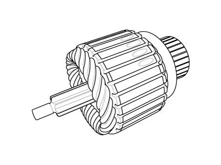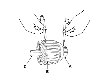 С помощью омметра проверьте отсутствие непрерывности между коллектором (A) и сердечником катушки якоря (B), а также между коммутатором и якорем вал (С). При наличии непрерывности замените якорь.