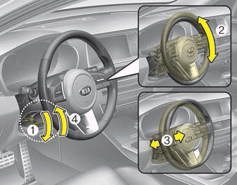 Чтобы изменить угол наклона рулевого колеса, потяните вниз рычаг разблокировки (1), отрегулируйте рулевое колесо на нужный угол (2) и высоту (3, если есть), затем потяните поднимите рычаг разблокировки, чтобы зафиксировать (4) рулевое колесо на месте. Обязательно отрегулируйте рулевое колесо в желаемое положение перед началом движения.