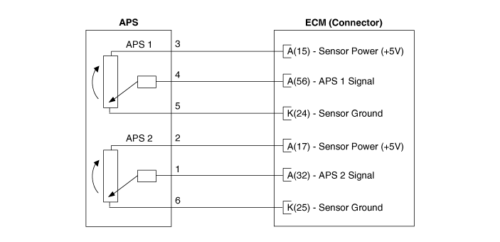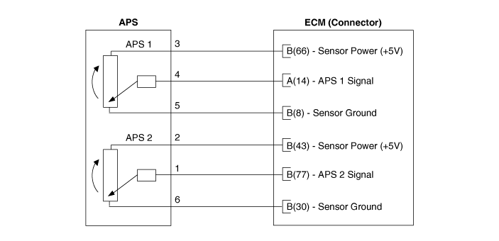 Измерьте выходное напряжение APS 1 и 2 на C.T и W.O.T.