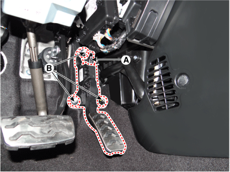 Отверните установочные гайки (В) и снимите модуль педали акселератора.