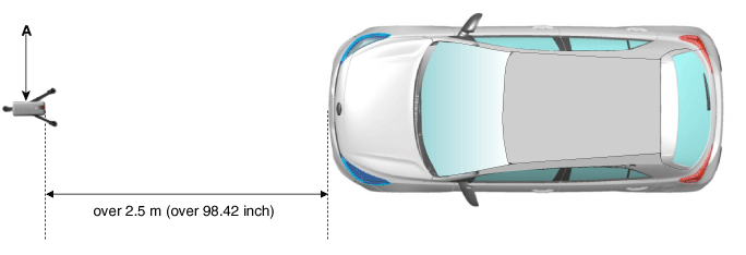 Отметьте (C) на расстоянии 2,3–2,5 м (90,55–98,42 дюйма) от (A) впереди автомобиля.