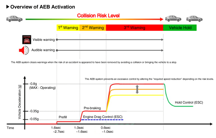 АЕБ система разработана, чтобы помочь избежать потенциального столкновения или уменьшить его воздействие, когда водители неадекватно тормозят, тормозят с задержкой или вообще не тормозят избежать столкновения.