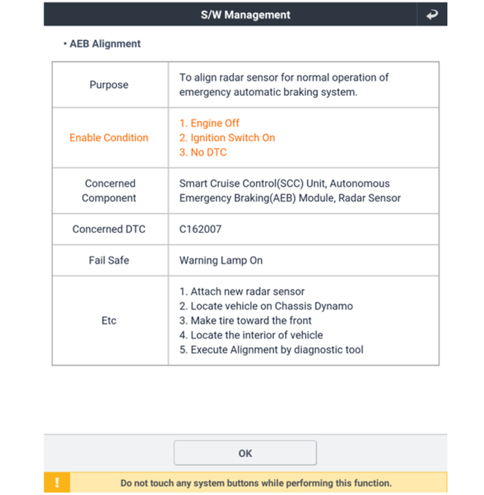 Быть Убедитесь, что автомобиль не движется и не испытывает вибраций, когда выполнение выравнивания датчиков (вход/выход или открытие/закрытие дверей).