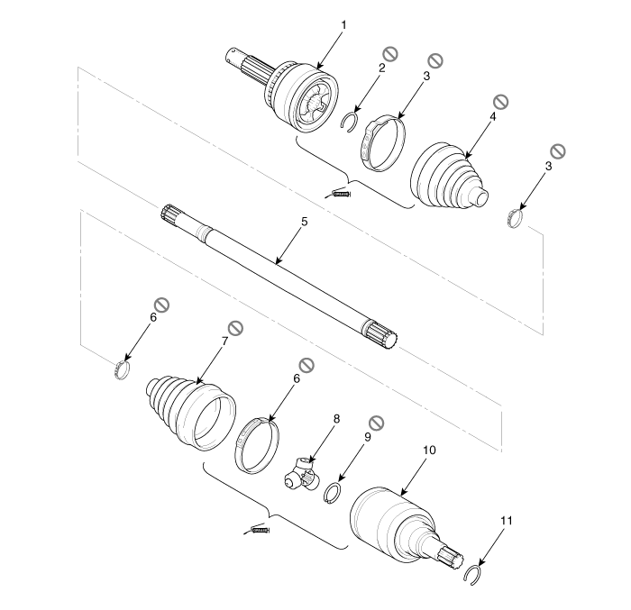 Компоненты и расположение компонентов Компоненты [Правый] 1. Сборка BJ 2. Зажим 3. Лента ботинка BJ 4. Ботинок BJ 5. Лента динамического демпфера 6. Динамический демпфер 7. Вал 8. Лента ботинка TJ 9. Ботинок TJ 10. Spi ...