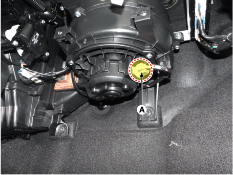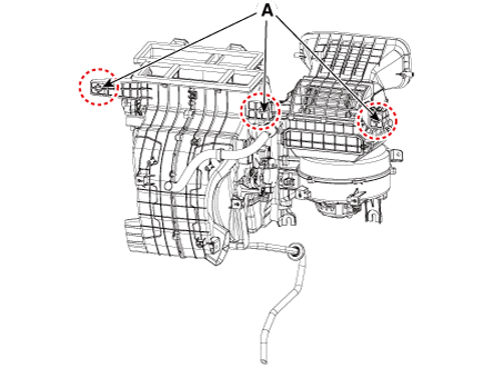 Снимите блок вентилятора (В) с блока отопителя (А) после ослабления винтов.