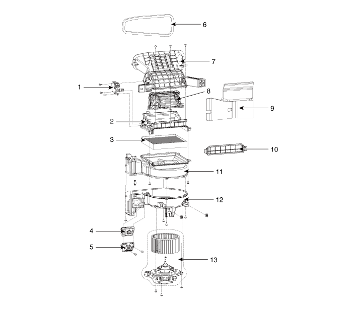 9. Антишумовая накладка 10. Крышка воздушного фильтра 11. Корпус воздуходувки [Верхний] 12. Корпус воздуходувки [нижний] 13. Двигатель вентилятора в сборе |