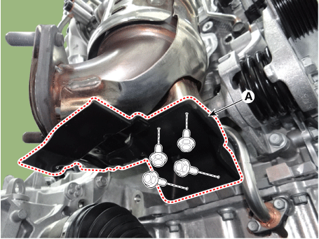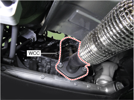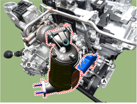 Снимите верхнюю опору (A) каталитического нейтрализатора прогрева (WCC), а затем снимите каталитический нейтрализатор прогрева (WCC) (B).