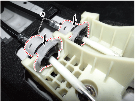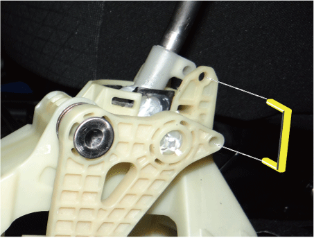 Установите трос выбора на штифт рычага, а затем вставьте стопорный штифт (А).